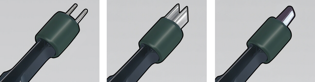 まず、バイポーラピンセット本体の電極接続部分には、主に3種類の形状が存在します。ご使用中のバイポーラコードの先端形状(鑷子と接続する側)がどのタイプに対応しているかを確認する必要があります。