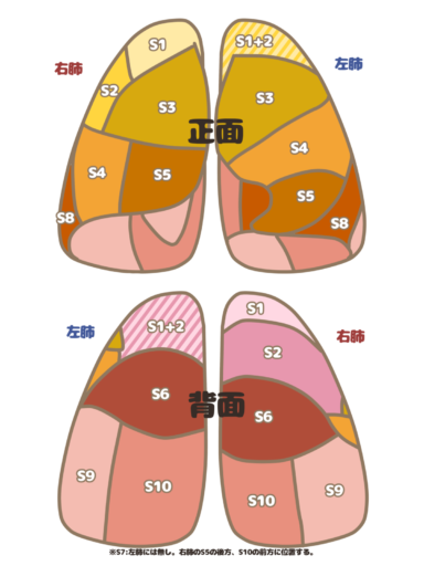 また、肺野はさらに細かく「肺区域」に分かれ、それぞれに気管支が枝分かれしています。
