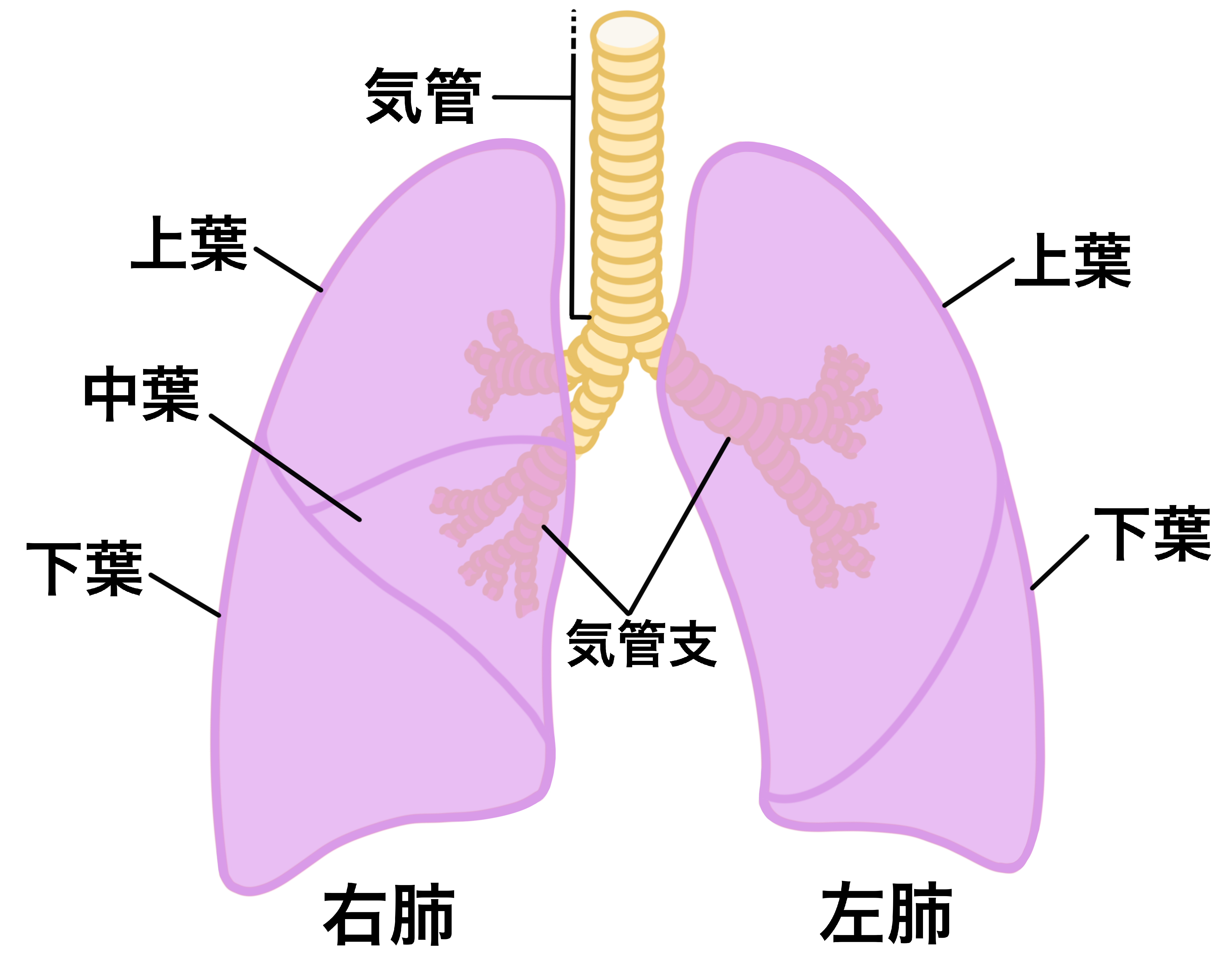 左肺:上葉・下葉の2つ(中葉に相当する部分は「舌区」と呼ばれる)