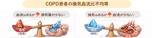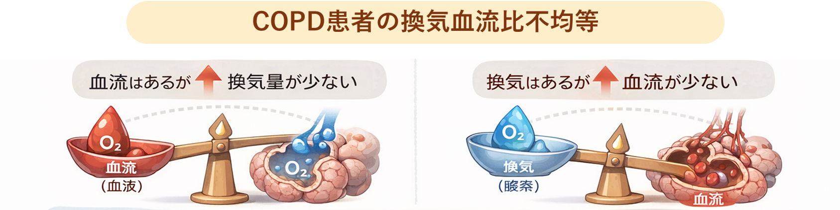 正常の状態では、肺胞内に取り込まれた酸素は拡散によって血管内へ移動し、ヘモグロビンと結合して全身へ運ばれます。しかし、COPD患者では、気道狭窄や肺胞壁の破壊により肺胞内への酸素の取り込みが不十分となります。さらに肺胞壁の破壊に伴い、酸素を受け入れる肺毛細血管床も減少します。その結果、血流があるが換気量が少ない、換気はあるが血流が少ないといった状態が生じることを換気血流比不均等といいます。