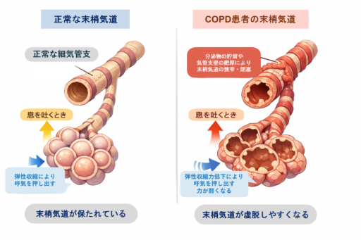 正常な末梢気道では、細気管支より末梢に軟骨がなく、周囲の肺胞の弾性収縮力によって気道内腔が保たれています。呼気時には肺胞の弾性収縮力により空気が外へ押し出されます。一方COPD患者では、気管支の炎症により、気道分泌物の貯留や気管支壁の肥厚が生じ、気道が狭くなります。さらに、肺胞壁の破壊によって肺胞腔が拡大(肺気腫)し、弾性収縮力が低下することで、末梢気道が虚脱しやすくなります。また、肺胞の弾性収縮力の低下により、呼気を押し出す力も弱くなります。これらの変化により、呼気が十分に行えず「息が吐きだしにくい」という症状が生じます。