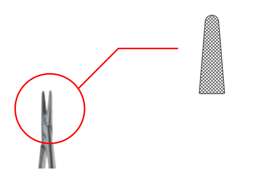 なお、カストロヴィエホ持針器は繊細で小さい針(丸針)を使用するため把持部にTCチップが貼られています。