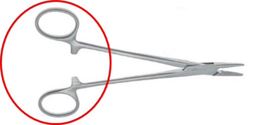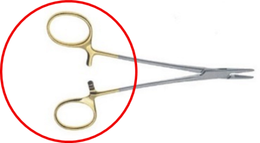 特徴:リングに親指と薬指をかけて使用します。先端が細く、マッチュー持針器に比べ細かい動きが可能。