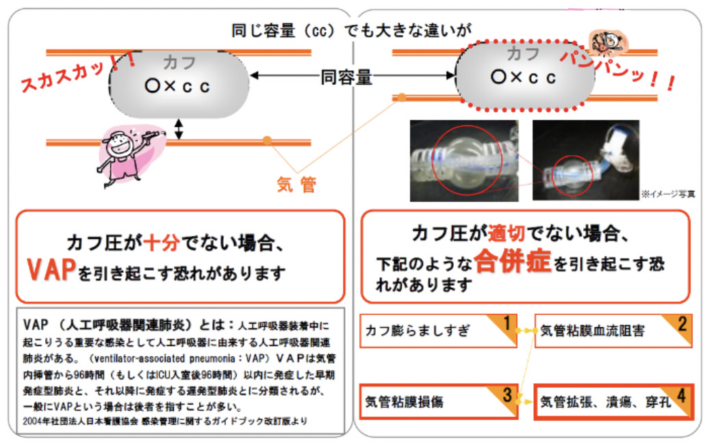 カフ圧計による圧管理であれば、患者1人1人にあったカフを調整することが可能です。