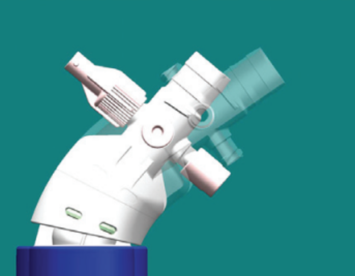●血液回路を無理なく最短にレイアウトするために、酸素加部と熱交換器部が独立して360°回転する新機構を開発しました。ガス入口ポート、静脈血出口ポート、動脈血出口ポートを任意の方向にセッティングできます。
