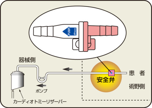 開心術中にベント回路及びサクション回路に過度の陽陰圧がかかる事を防ぐとともに、ポンプ側からの逆流を防止する安全弁です。