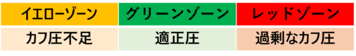 カラーコードで簡単にカフ圧の状態を確認できます。